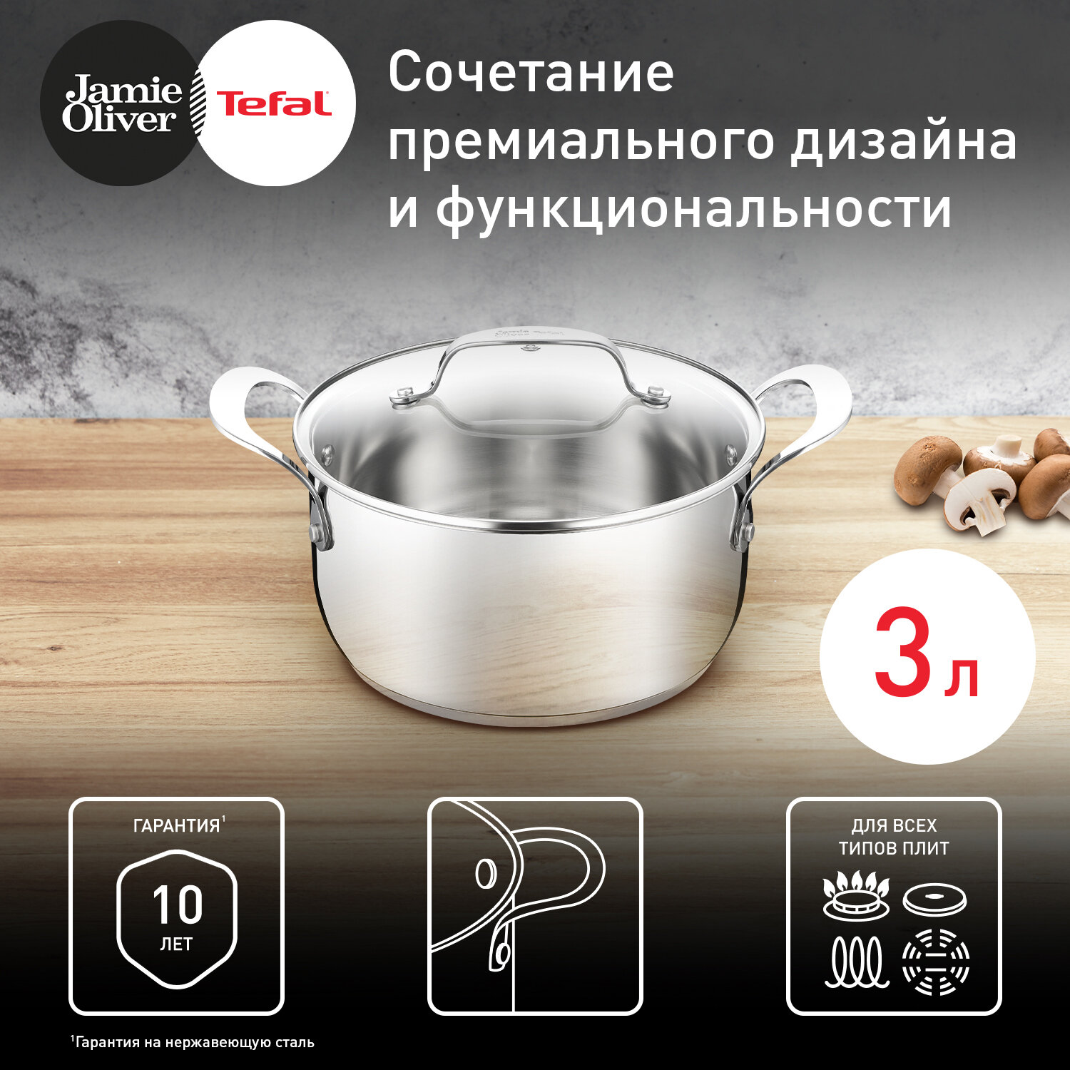 Кастрюля Tefal Jamie Oliver E3154474 с крышкой 20 см. 3 литра интересное: