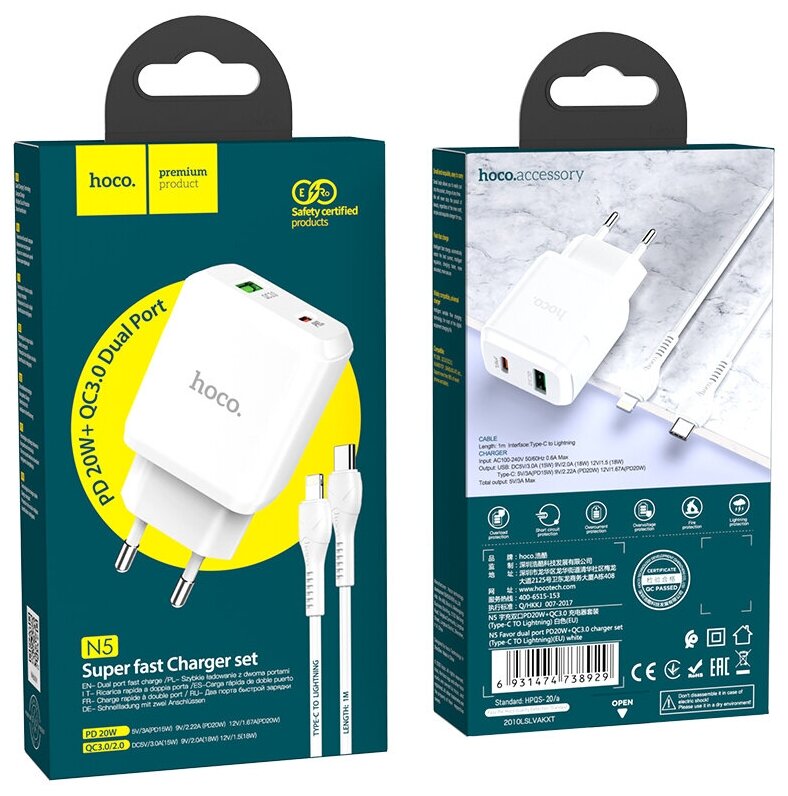 СЗУ HOCO N5 Favor dual port PD20W+QC3.0 charger set Lightning белый
