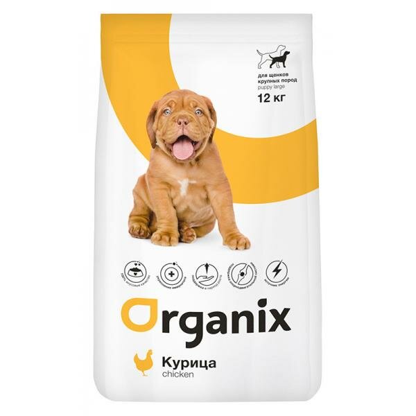 Organix полнорационный сухой корм для щенков крупных пород с курицей для здорового роста и развития, 12 кг