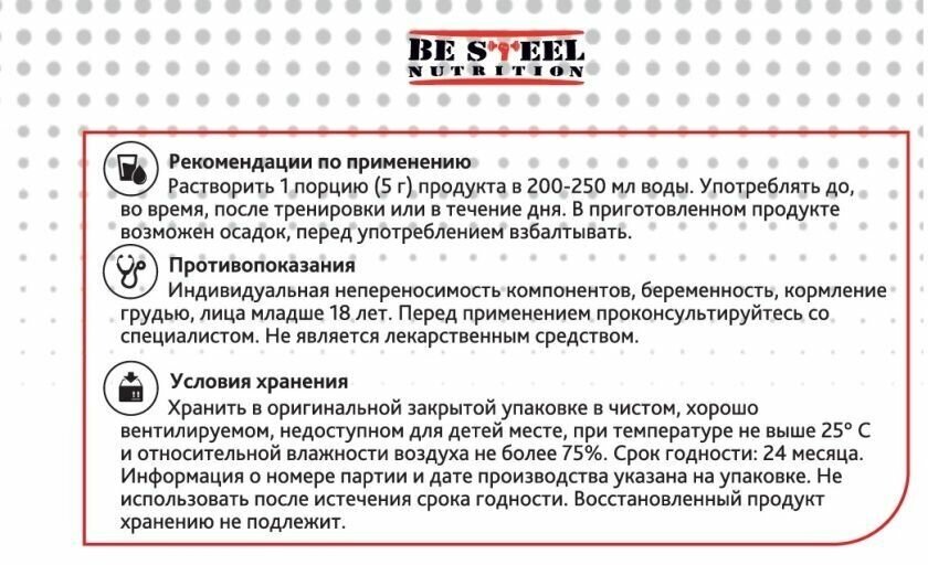 БЦАА быстрорастворимый, Be Steel Nutrition BCAA Instant 2:1:1 500г (натуральный) в порошке