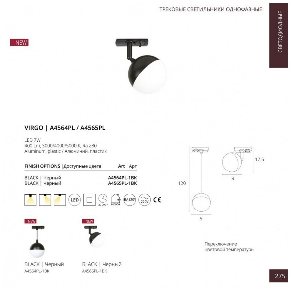 Трековый светильник Arte Lamp Virgo A4564PL-1BK, Черный, LED