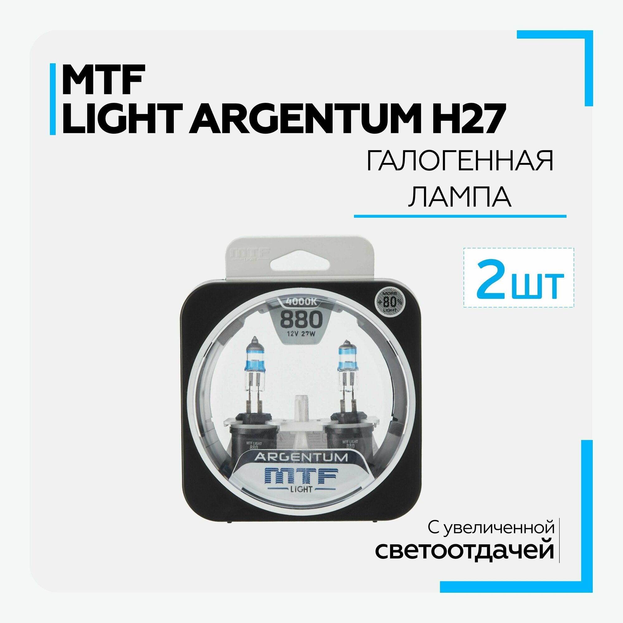 Купить Галогенные автолампы MTF Light серия ARGENTUM +80% Н27(880), 12V, 27W (комплект 2 шт.)
