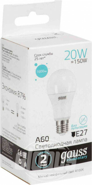 Gauss Светодиодная Лампа Elementary A60 20W 1600lm 4100K E27 LED 1/10/50 23229 интересное: