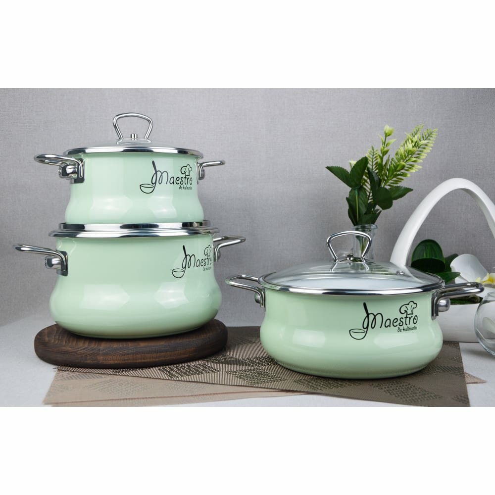 Набор эмалированной посуды 3 предмета "Maestro", салатовый / эмалированная кастрюля / кастрюля со стеклянной крышкой / набор кастрюль