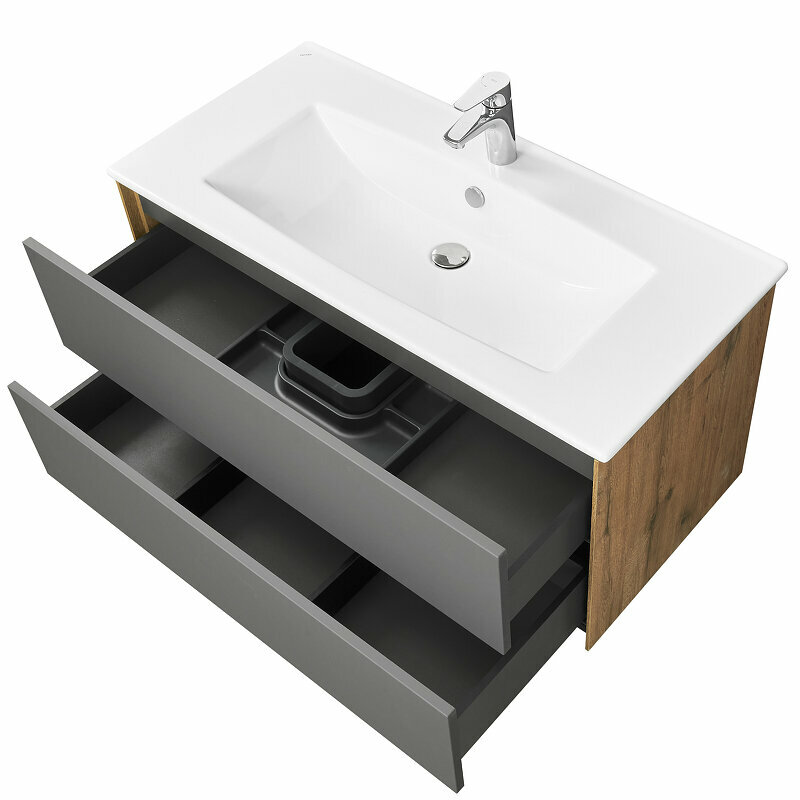 Модуль под раковину Акватон Сохо 98х45,5х47,2см, арт. 1A258201AJA00, система push-to-open, 2 ящика, графит софт / дуб веллингтон