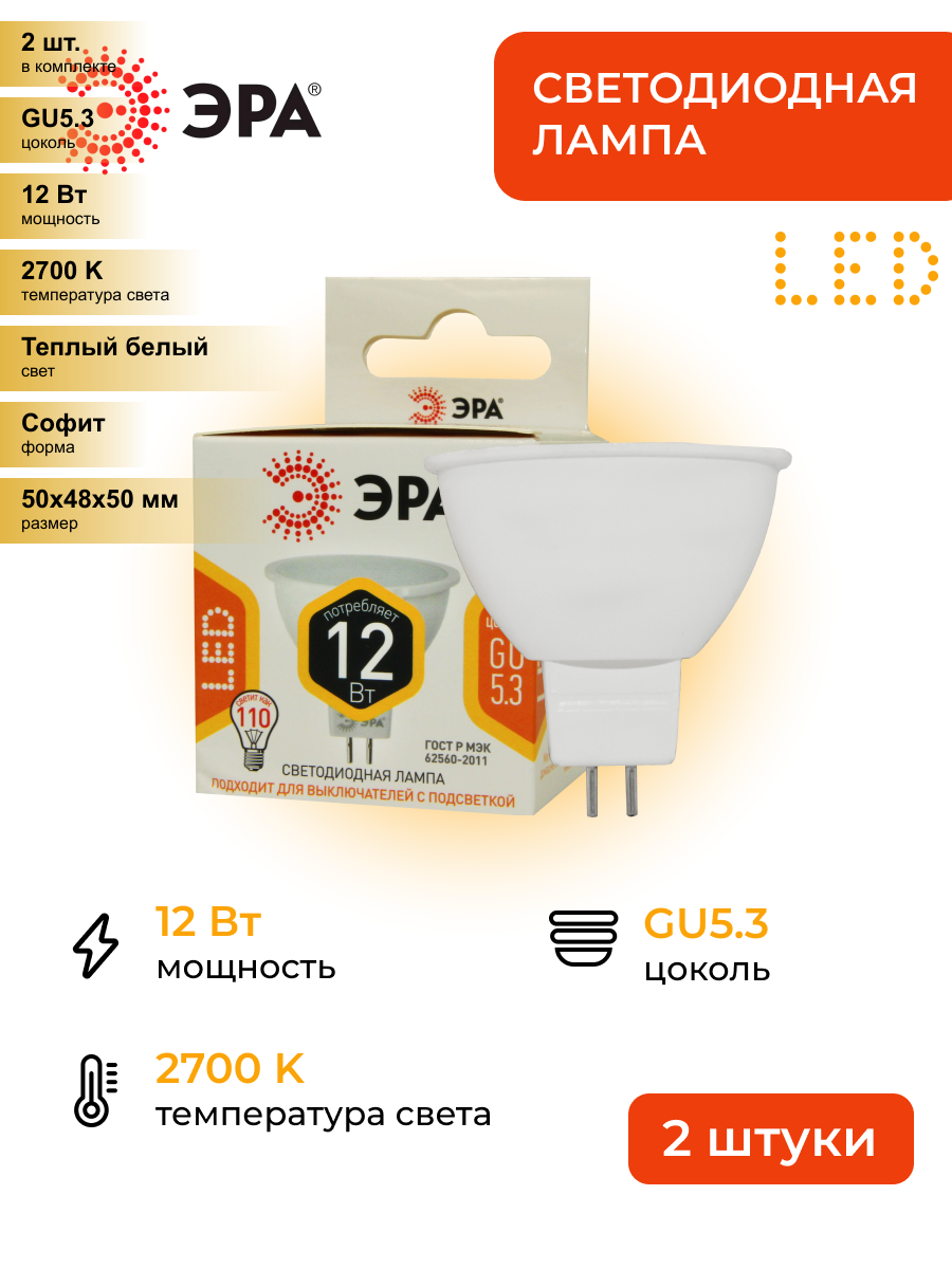 Светодиодная лампа ЭРА 12W эквивалент 110W 2700K 960Лм GU5.3 для спотов MR16 (комплект из 2 шт)