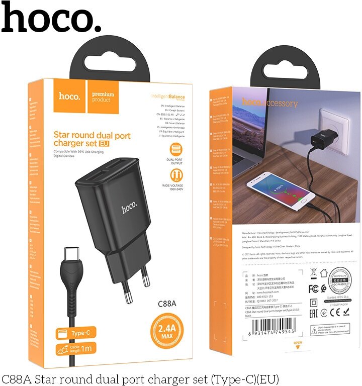 Сетевое зарядное устройство, 2 USB 2.4A (C88A), HOCO, Type-C, черный