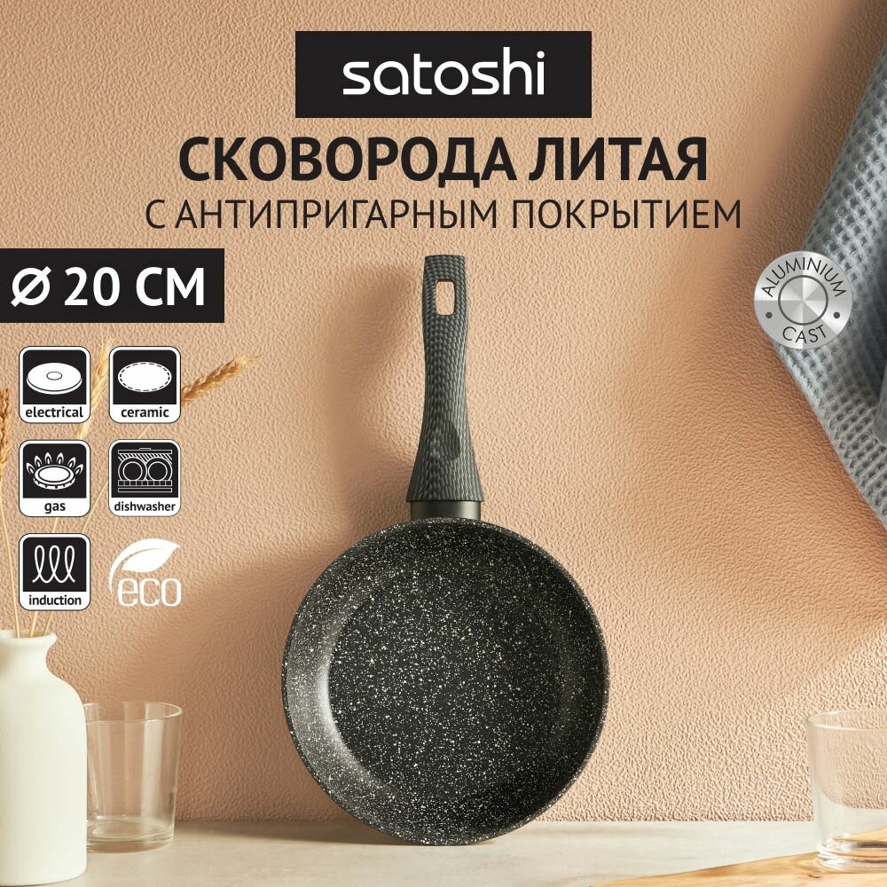 Сковорода Satoshi Карбон, 20 см, из литого алюминия с антипригарным покрытием под мрамор, без крышки, индукция