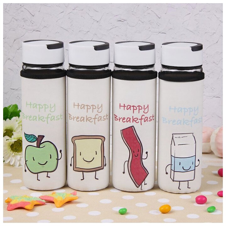Купить Бутылка для воды стеклянная с ручкой в чехле «Завтрак», 500 мл, h=23,5 см, рисунок микс