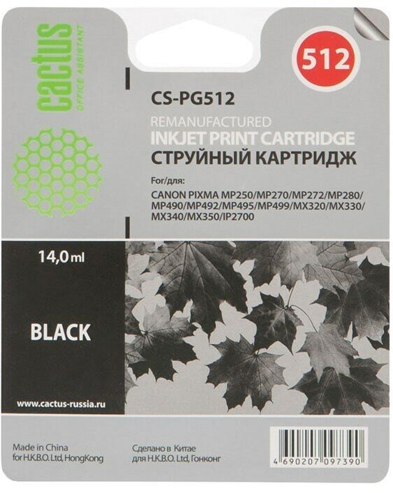 Картридж струйный Cactus CS-PG512 черный (15мл) для Canon Pixma iP2700/MP240/MP250/MP260/MP270/MP272/MP280/MP480/MP490/MP492/MP495/MX320/MX330/MX340/MX350