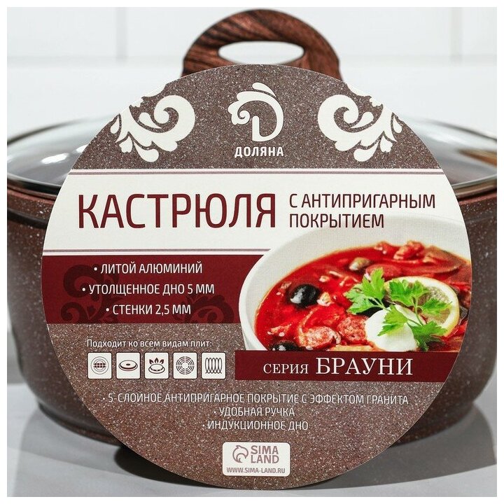Кастрюля Брауни, 3,3 л, стеклянная крышка, индукция, антипригарное покрытие Доляна 7261587 . интересное: