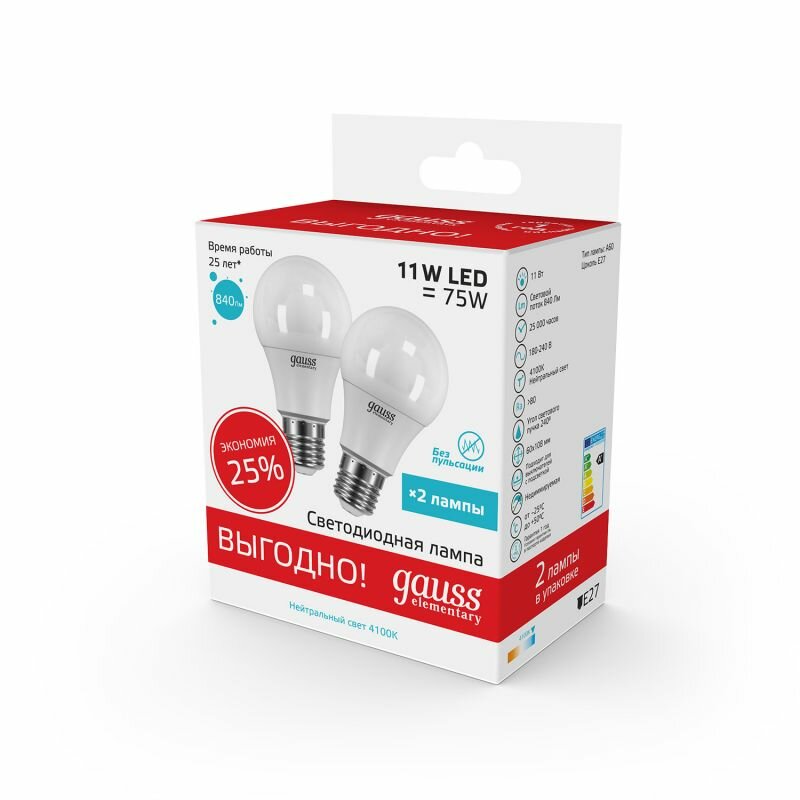 Gauss Лампа Elementary A60 11W 840lm 4100K E27 (2 лампы в упаковке) LED