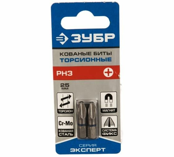 Биты ЗУБР ″эксперт″ PH3 x 25 мм., торсионные кованые, обточенные, хромомолибденовая сталь, 2 шт. (26011-3-25-2)