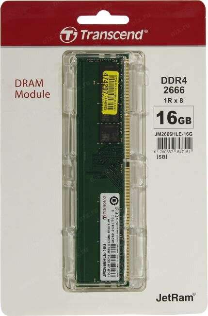 Оперативная память Transcend JetRam 16 ГБ DDR4 2666 МГц DIMM JM2666HLE-16G Non-ECC 1Rx8 CL19 1,2V