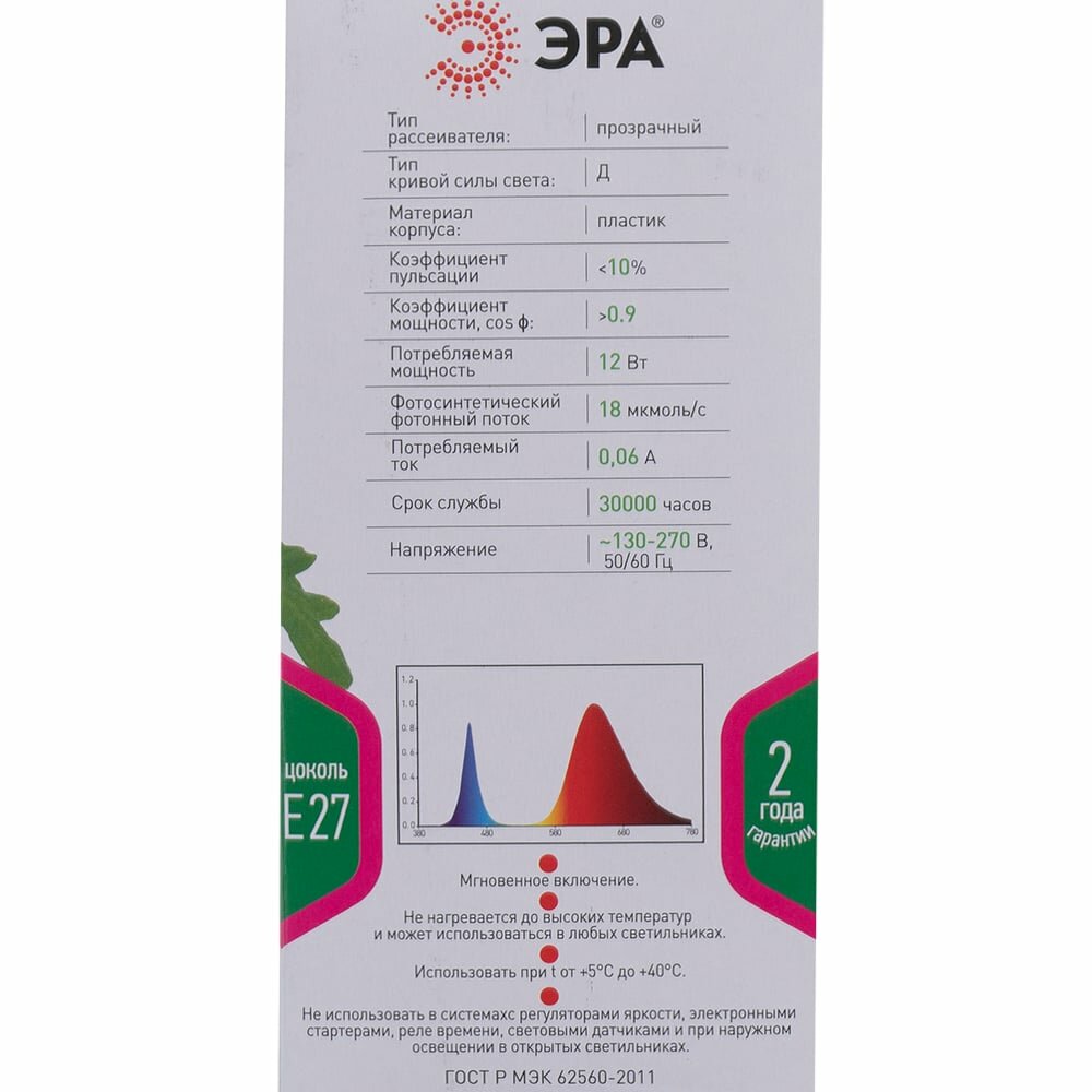 | Дополнительная информация | светоотдача Лм/Вт: не нормируется; индекс цветопередачи Ra: не нормируется; красно-синий спектр: 90% спектра эффективны для любых видов и сортов растений; фотосинтетический фотонный поток: 15 мкмоль/c |
