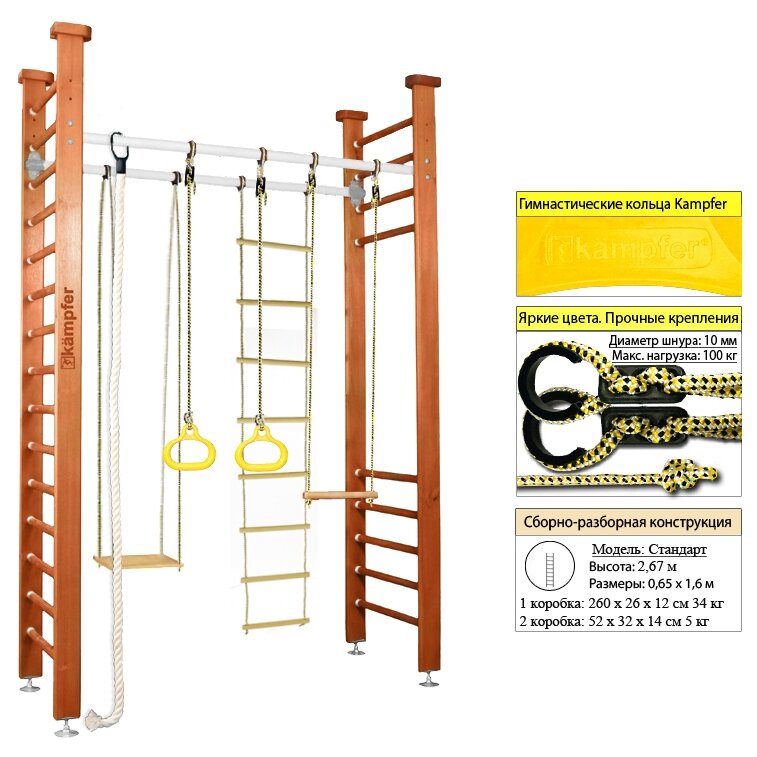 | Дополнительная информация | стойки из сосны; ступени из березы; ширина стойки лестницы : 10 см; металлические перекладины для навесного оборудования, размеры: длина 150 см, диаметр 4,2 см, высота расположения от пола 2,25 м |