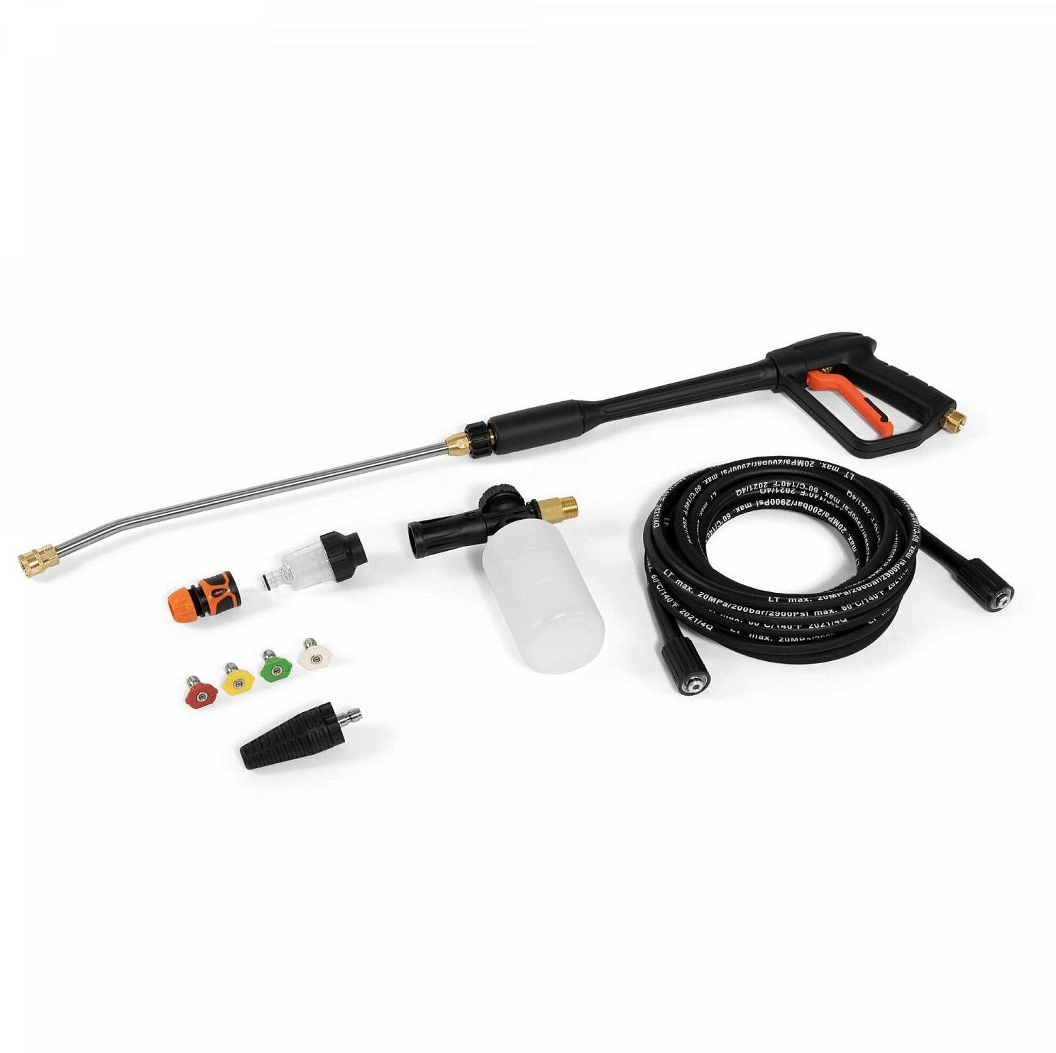 В комплекте 4-ре насадки и бутылка для пены. Ранее пользовался мойкой другого бренда (премиальный) скажу, что эта мойка супер. |