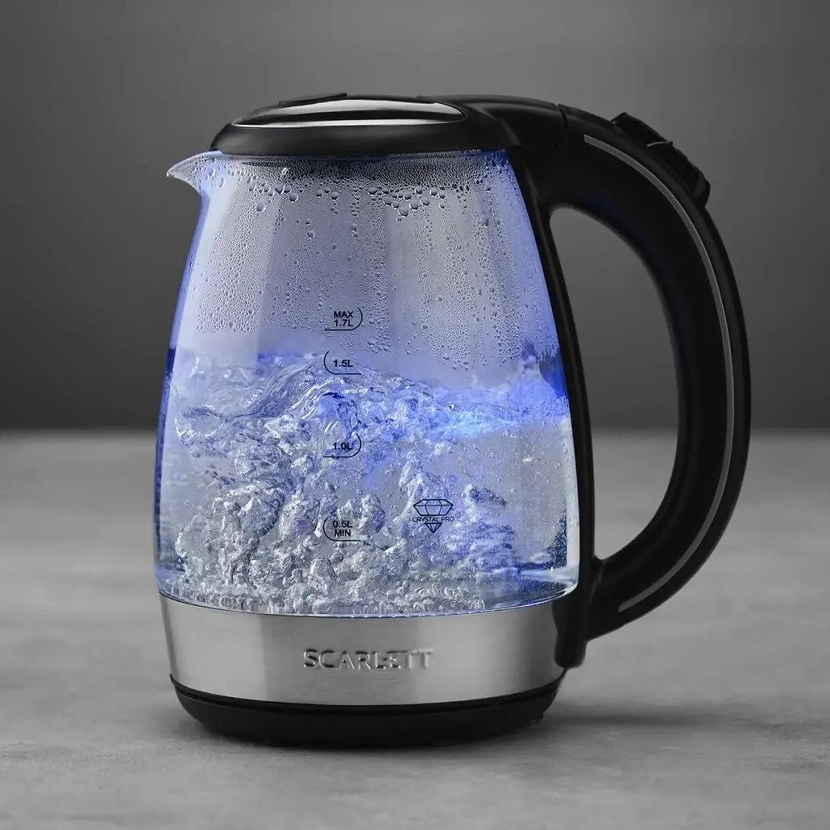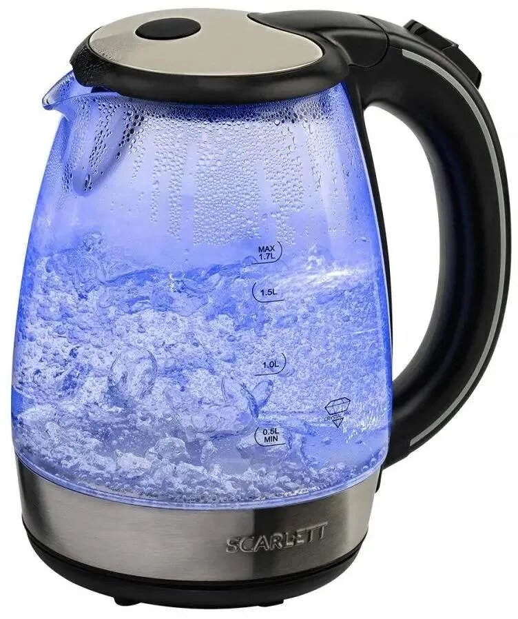 Удачная новинка от Скарлет, чайник просто находка, закипает очень быстро, есть подсветка, при закипании зрелище завораживает. Крышка открывается автоматически и довольно широко, воду доливать удобно. Ручка большая, в хвате удобная, рука не проскальзывает.