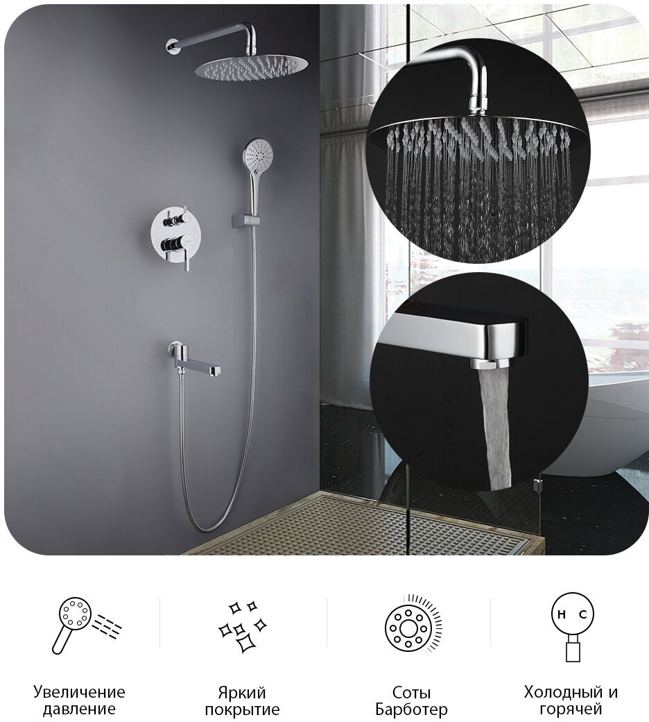| Дополнительная информация | диаметр душевой лейки: 115 мм; диаметр верхнего душа: 250 мм |