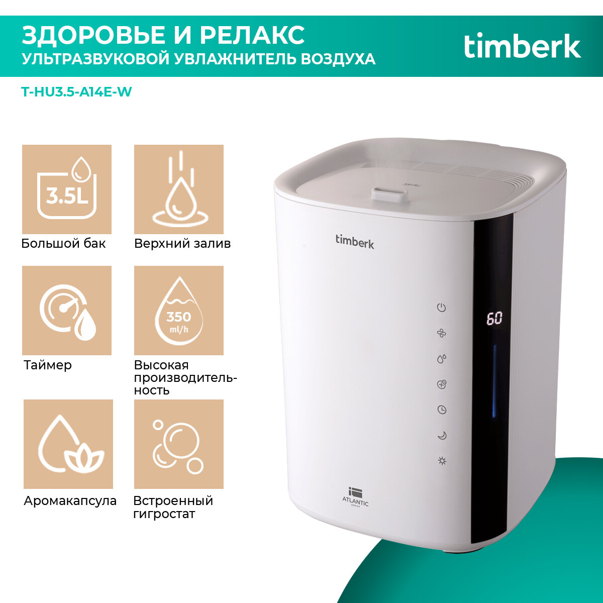 Увлажнитель воздуха Timberk Atlantic T-HU3.5-A14E-W, 3,5 л, распыление до 350 мл/час