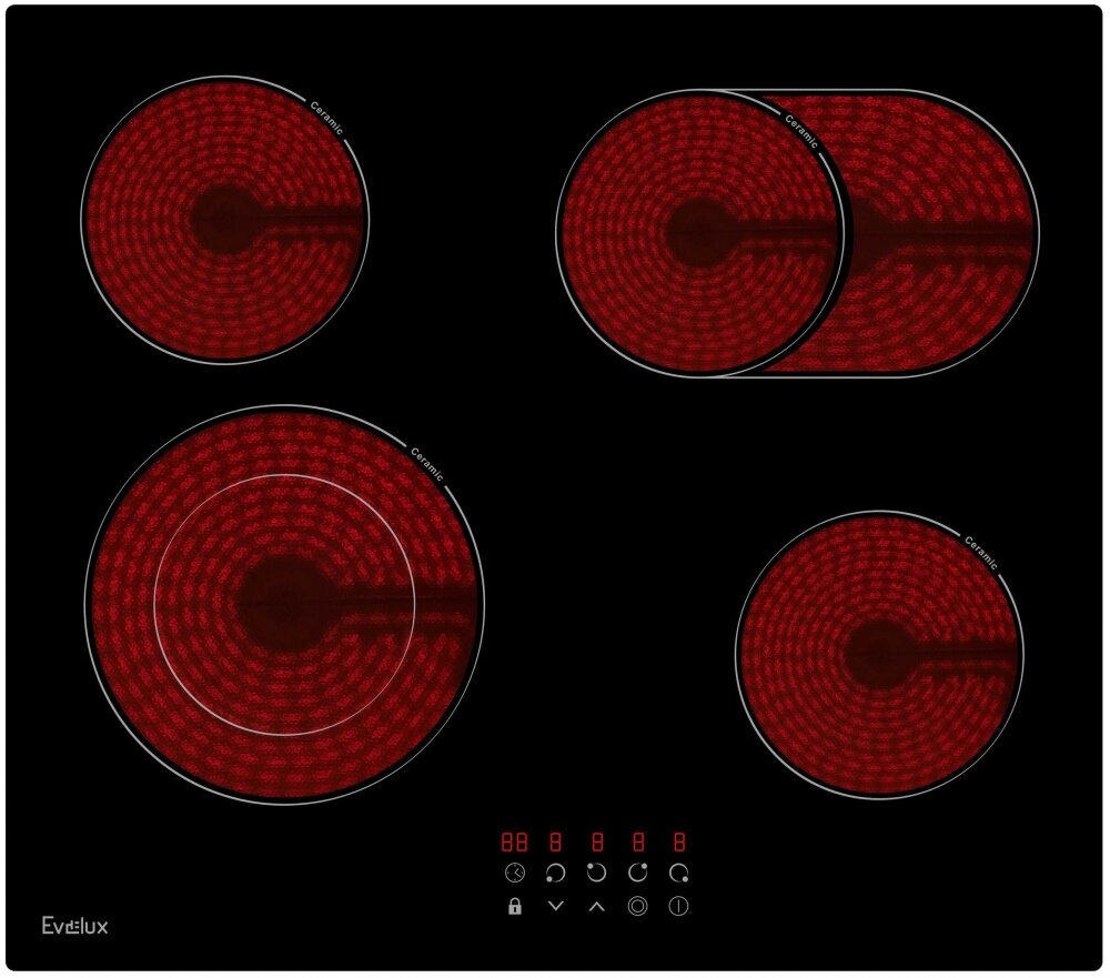 Варочная панель EVELUX электрическая, стеклокерамика, Hi Light, 60 см, 4 конфорки, сенсорное управление, 9 уровней мощности, таймер 1-99 мин, блокировка управления, защитное отключение, двухконтурная, овальная зона, 6600 Вт, черное стекло, 590х520х50 мм.