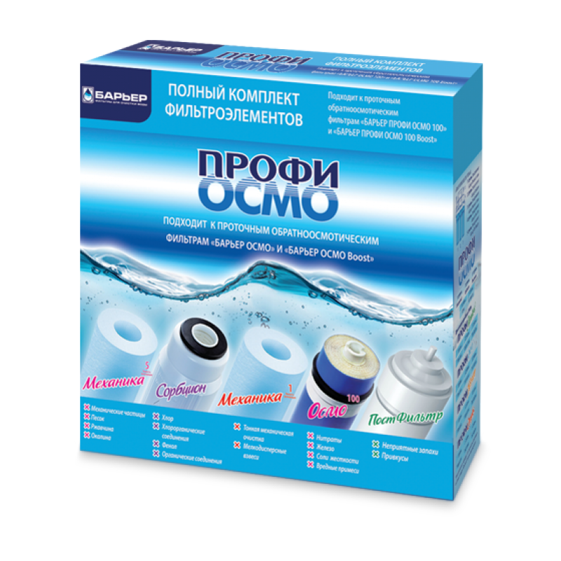 | Дополнительная информация | комплект фильтроэлементов ПРОФИ Осмо предфильтр (1-3 ступени): производительность - 2 л/мин; комплект фильтроэлементов ПРОФИ Осмо финиш (4-5 ступени): производительность - 0,2 л/мин |