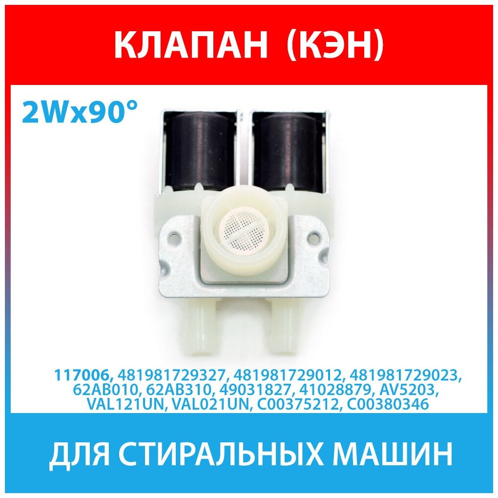 Клапан подачи воды для стиральной машины Whirlpool, Indesit, Ariston, Zanussi, Electrolux, Ardo, LG количество выходов 2 угол 90? клеммы раздельно AV5203 481981729327, VAL121UN, 49031827u, C00375212, 16ev17bt, VAL210UN, `AV52100, `AV5200, 481981729012, 48