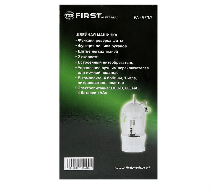 5700 Швейная машинка FIRST Электропитание : DC 6В, 800 мА / от 4 батареи АА" Green