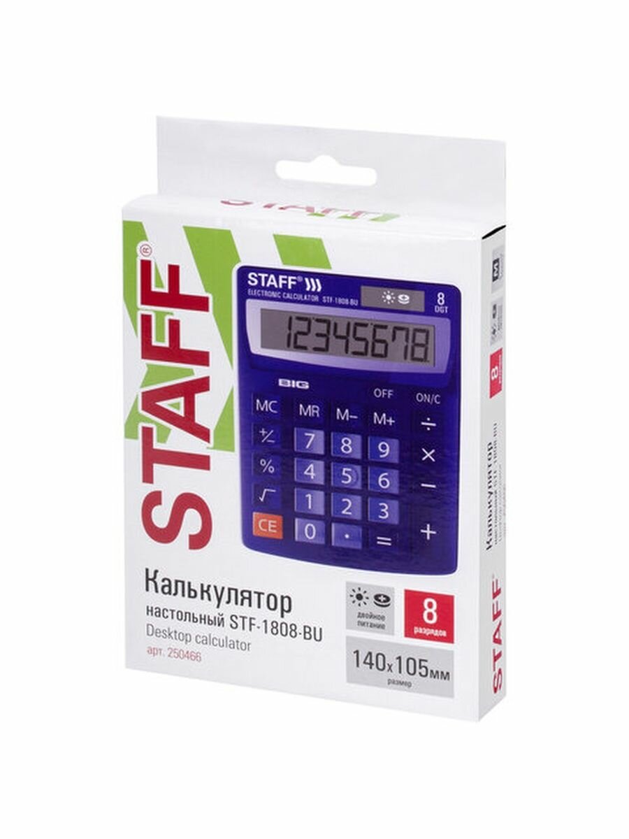Калькулятор настольный STAFF STF-1808-BU, компактный (140х105 мм), 8 разрядов, двойное питание, синий, 250466