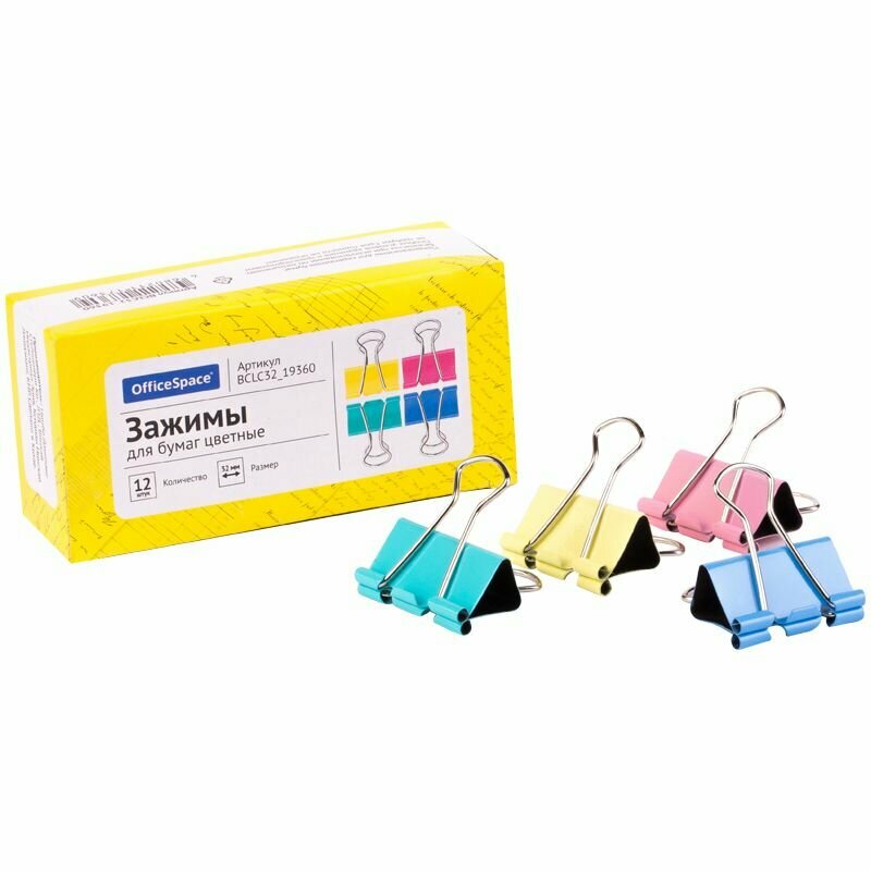 Зажимы для бумаг 32мм, OfficeSpace, 12шт., цветные, картонная коробка BCLC32_19360