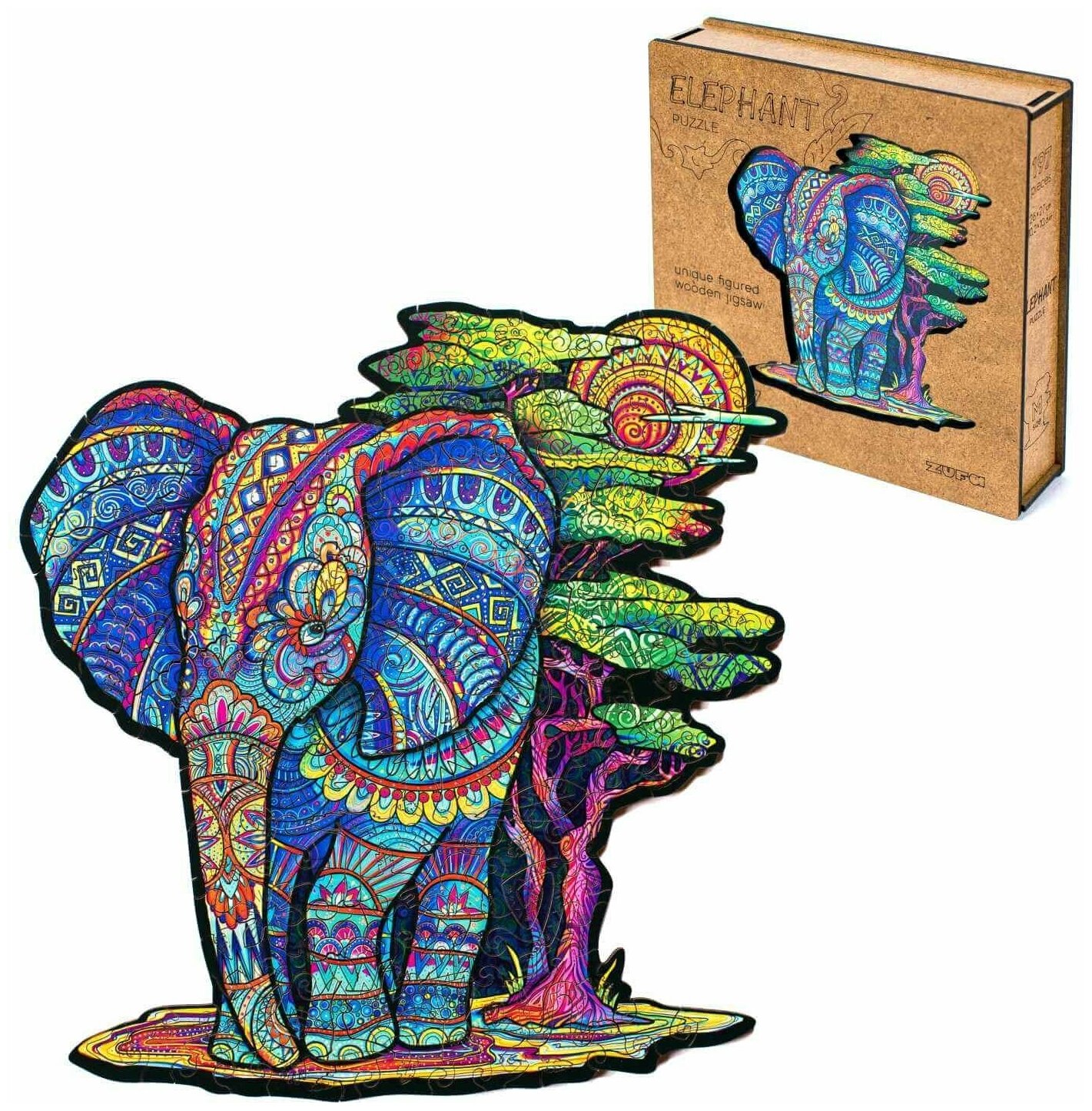 Деревянные пазлы для взрослых и детей Zufa с 3D фигурками , Слон - 197 деталей, 26х27см.