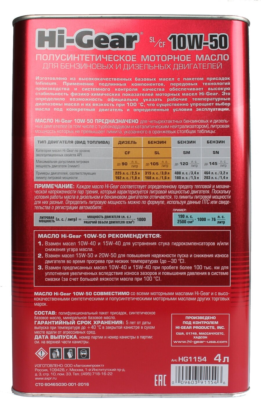 Масло моторное п/синтет. 10W-50 SL/CF 4л HI-GEAR hg1154 1шт