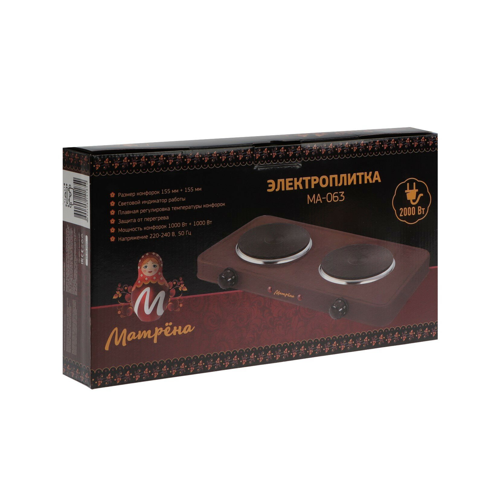 Плитка электрическая матрёна МА-063, 2000 Вт, 2 конфорки, коричневая