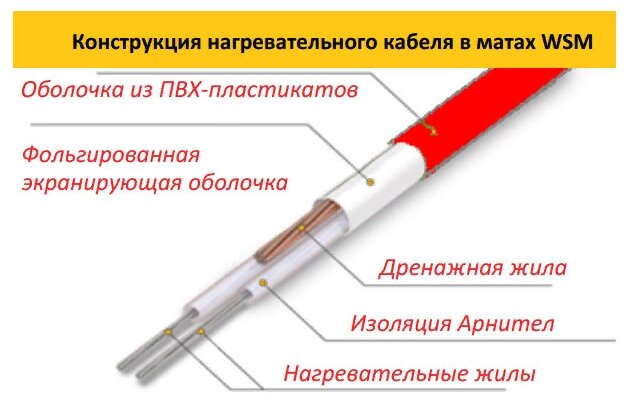 | Плюсы: | Диаметр кабеля достаточный чтобы спрятать в клей под керамогранит. У мена слой 6 мм. |