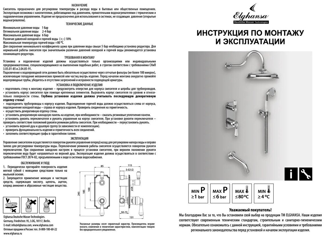 | Дополнительная информация | Немецкая компания «Elghansa» разрабатывает передовые высококачественные смесители для ванной и кухни. Высокий уровень качества изделий «Elghansa» - результат постоянного контроля производства, упаковки и транспортировки товаров. |