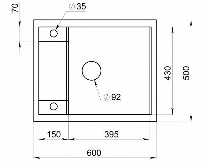 Кухонная мойка кварцевая Granula GR-6002 односекционная квадратная с крылом, врезная, чаша 395x430, цвет шварц (6002sv)