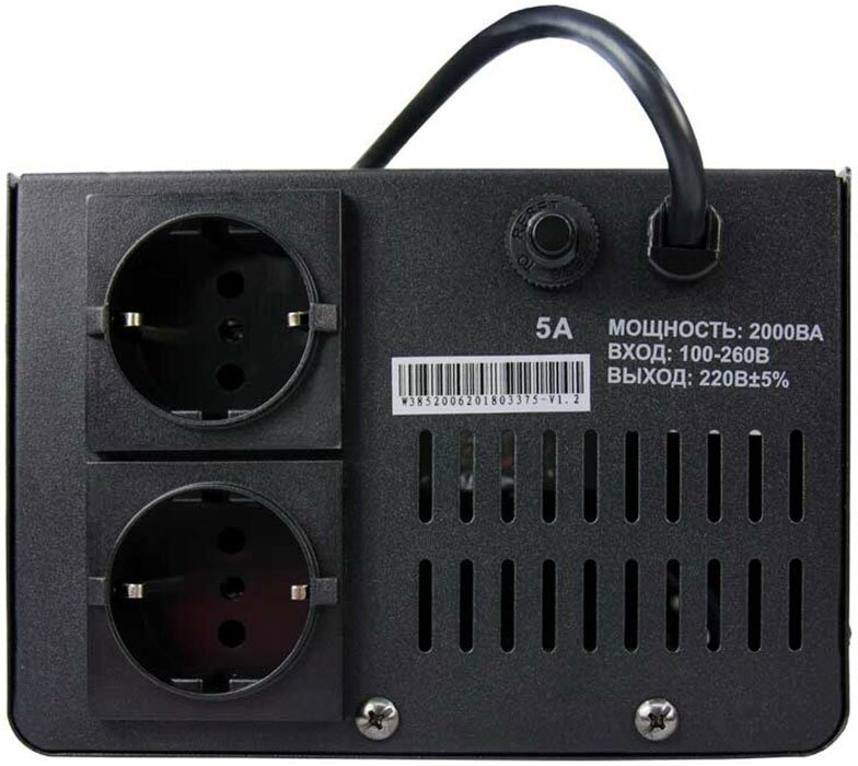 | Дополнительная информация | мин. входное напряжение (предельное): 95 В; макс. входное напряжение (предельное): 280 В; мин. выходное напряжение (фазное): 209 В; макс. входное напряжение (рабочее): 260 В; макс. входная частота: 50 Гц; мин. входная частота: 50 Гц; количество выходных розеток (общее): 2 шт.; время отклика: 10 мс; количество ступеней стабилизации: 7 шт. |
