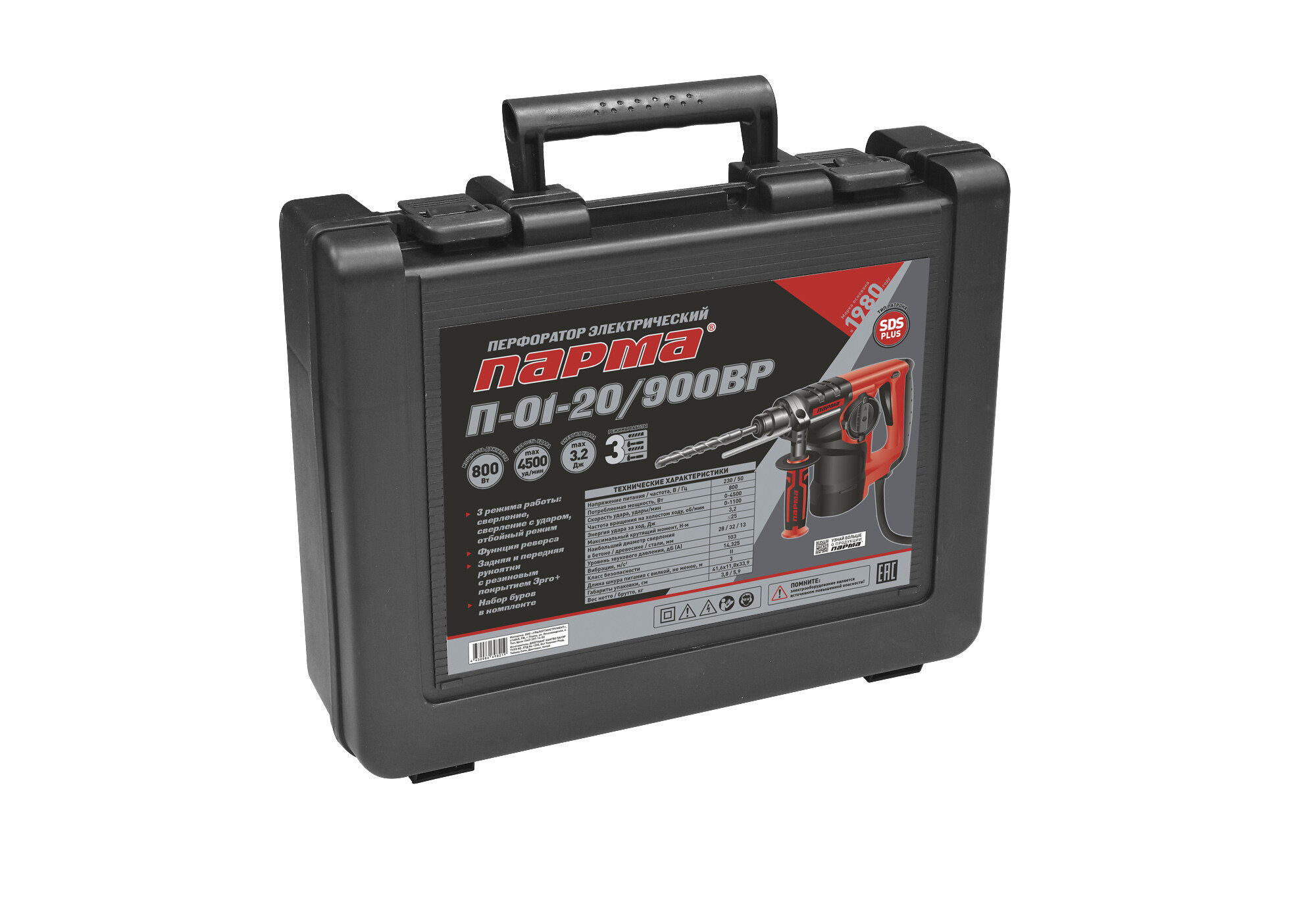 Перфоратор парма SDS-plus П-01-20/900ВР (900Вт,3реж,3.2Дж,бетон 20/68мм,верт.дв.)3.8кг кейс+5насадок