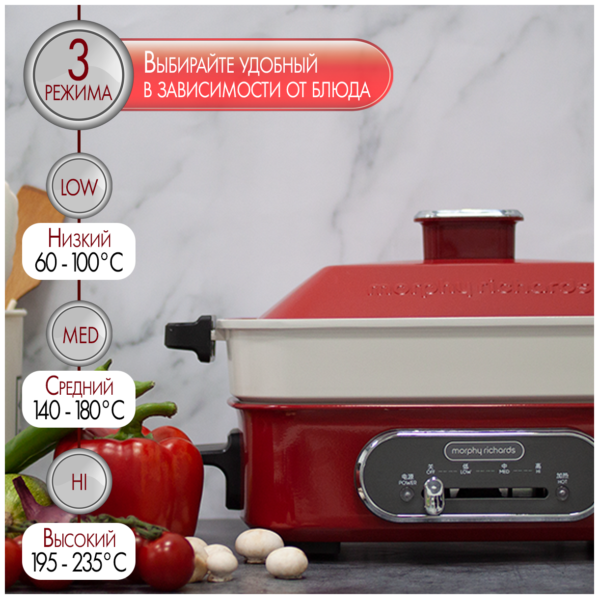 Мультиварка для здорового питания, мультиповар, термо кастрюля с крышкой, с антипригарным покрытием Morphy Richards Multifuntion, 3 литра, красный