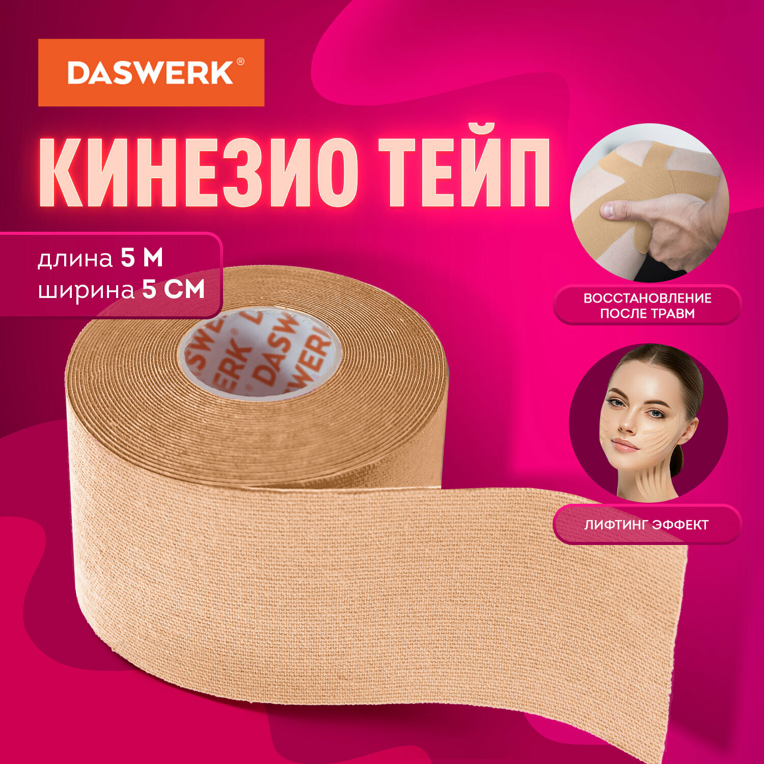 Кинезио тейп/лента для лица и тела, омоложение и восстановление, 5 см х 5 м, розовый, DASWERK,680004