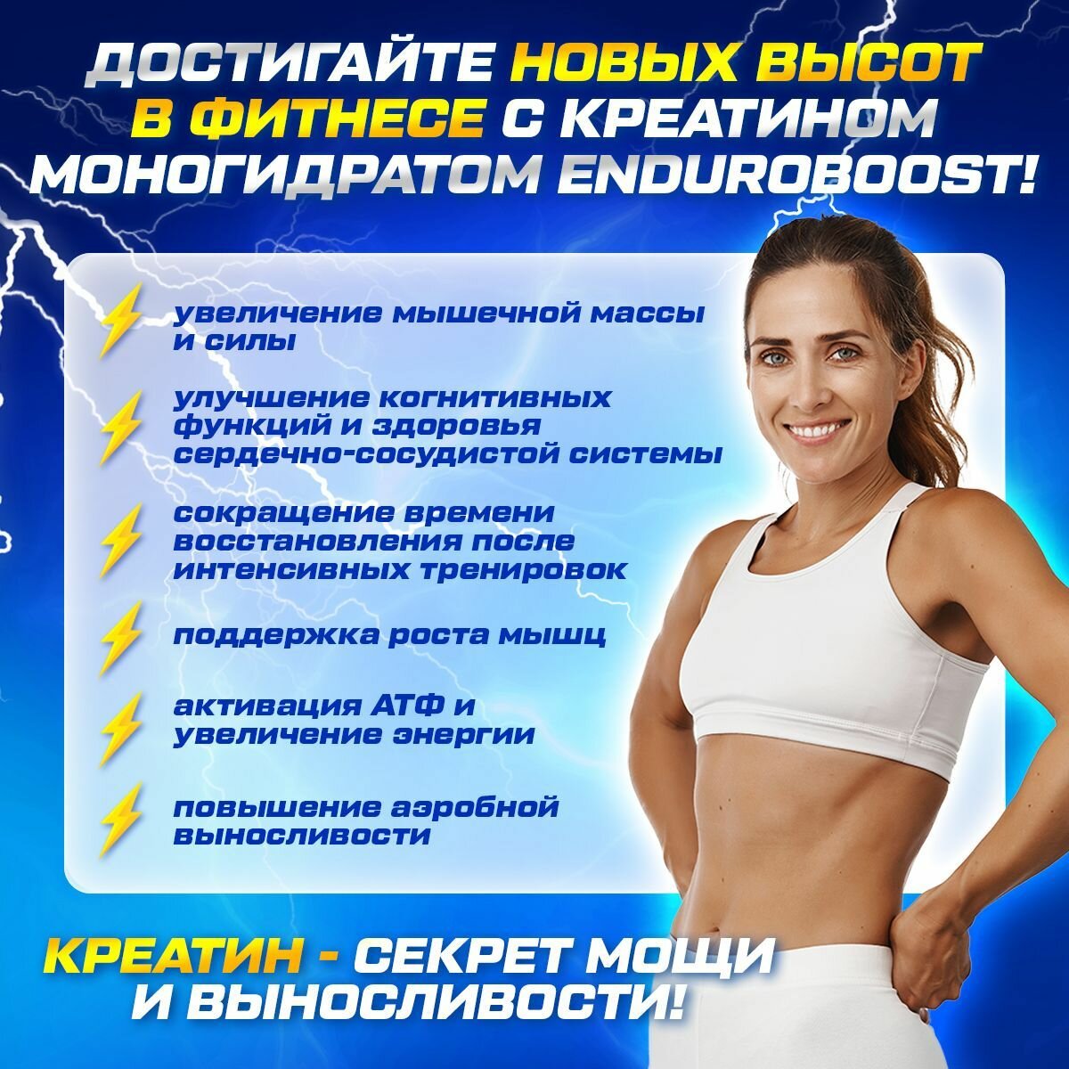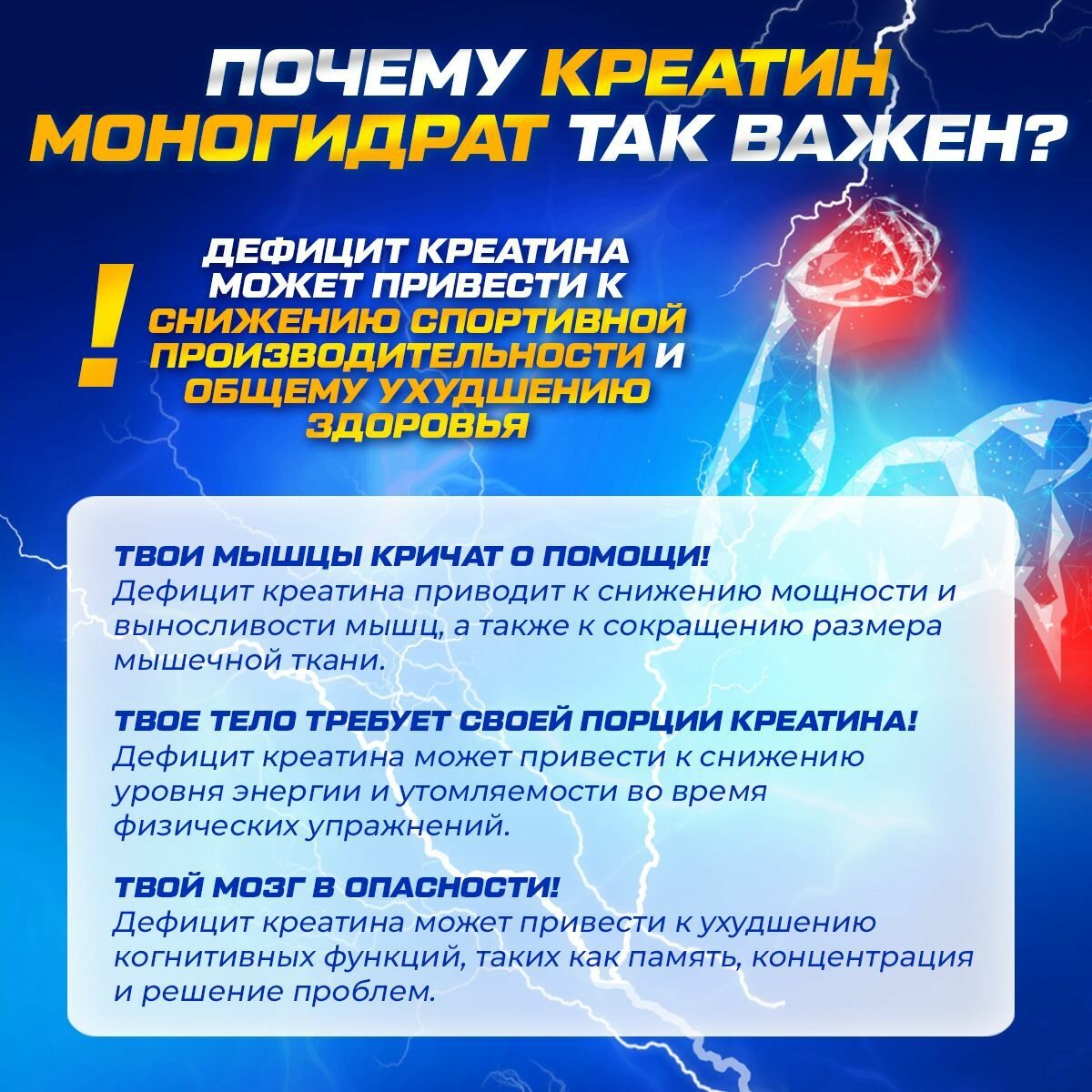 | Дополнительная информация | Увеличение мышечной массы и силы - Сокращение времени восстановления после интенсивных тренировок - Улучшение когнитивных функций и здоровья сердечно-сосудистой системы - Поддержка роста мышц - Активация АТФ и увеличение энергии - Повышение аэробной вынос |