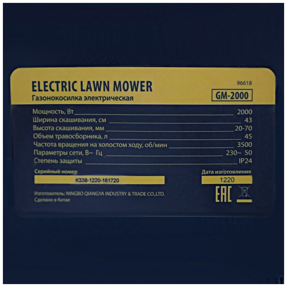 Газонокосилка электрическая GM-2000, 2000 Вт, ширина 43 см, 6 уровней, травосборник 45 л. Denzel 96618