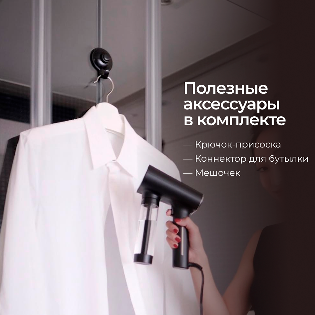 | Плюсы: | можно подсоединить другой резервуар для воды, от того что в наборе отпариватель работает до 10 минут, это интересная задумка по моему мнению, особенно когда нужно отпарить большое количество вещей становится полезным, также в наборе крючек на присоске, отпариватель с ним удобно брать с собой, есть мешочек для хранения |
