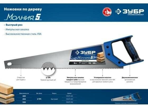 Ножовка по дереву (пила) ЗУБР МОЛНИЯ-5 450мм , 5TPI, апрямой крупный зуб, быстрый рез поперек волокон, для крупный и средних заготовок 15075-45