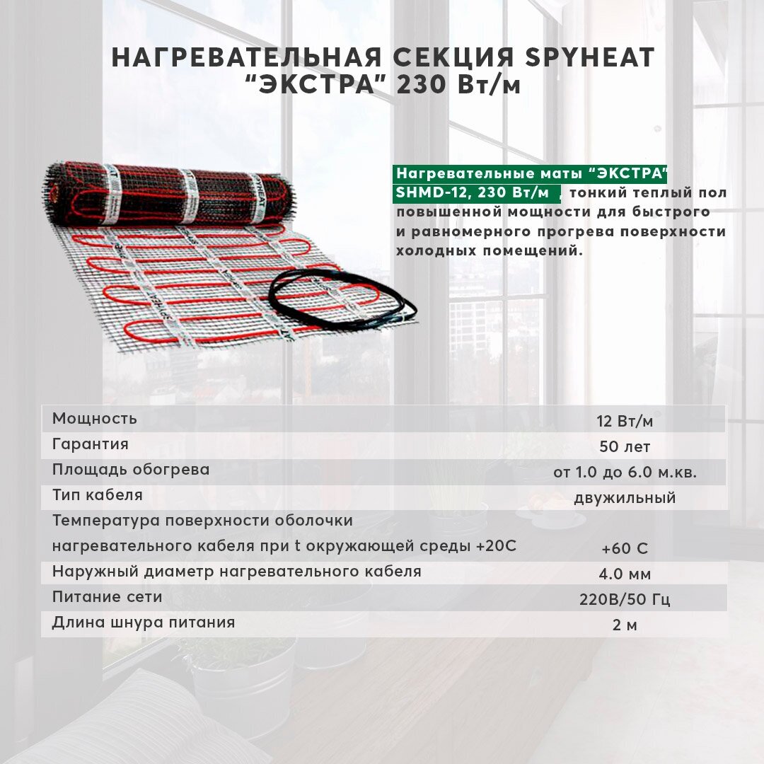Мат теплого пола SPYHEAT экстра SHMD-12-5-1150, площадь укладки 5 кв.м, мощность мата 230 Вт