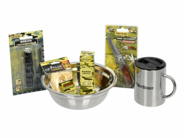 Набор Выжить любой ценой /спички/сухое горючее/роллы для розжига/фонарь/термокружка/нож/миска BOYSCOUT
