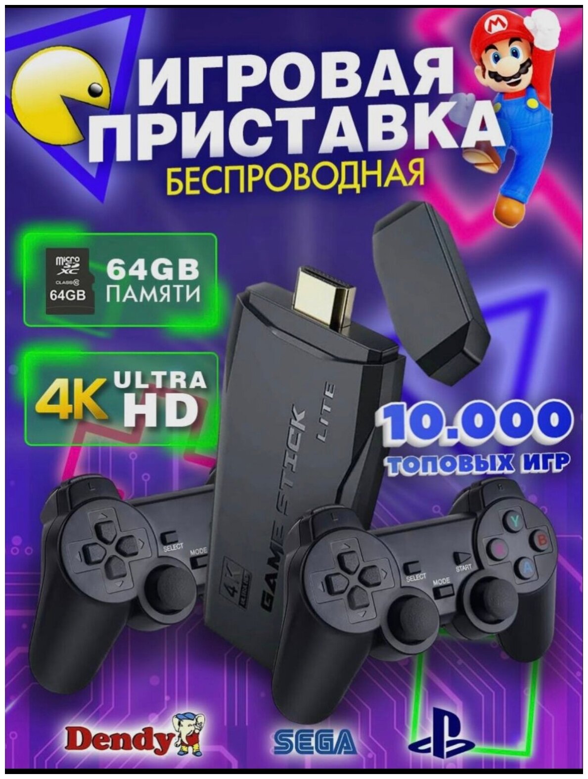 Игровая приставка, консоль Game Stick Lite 64Gb, 3555 игр, 4K, 2,4 ГГц, 8 бит, 16 бит, 32 бит