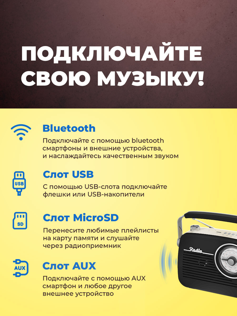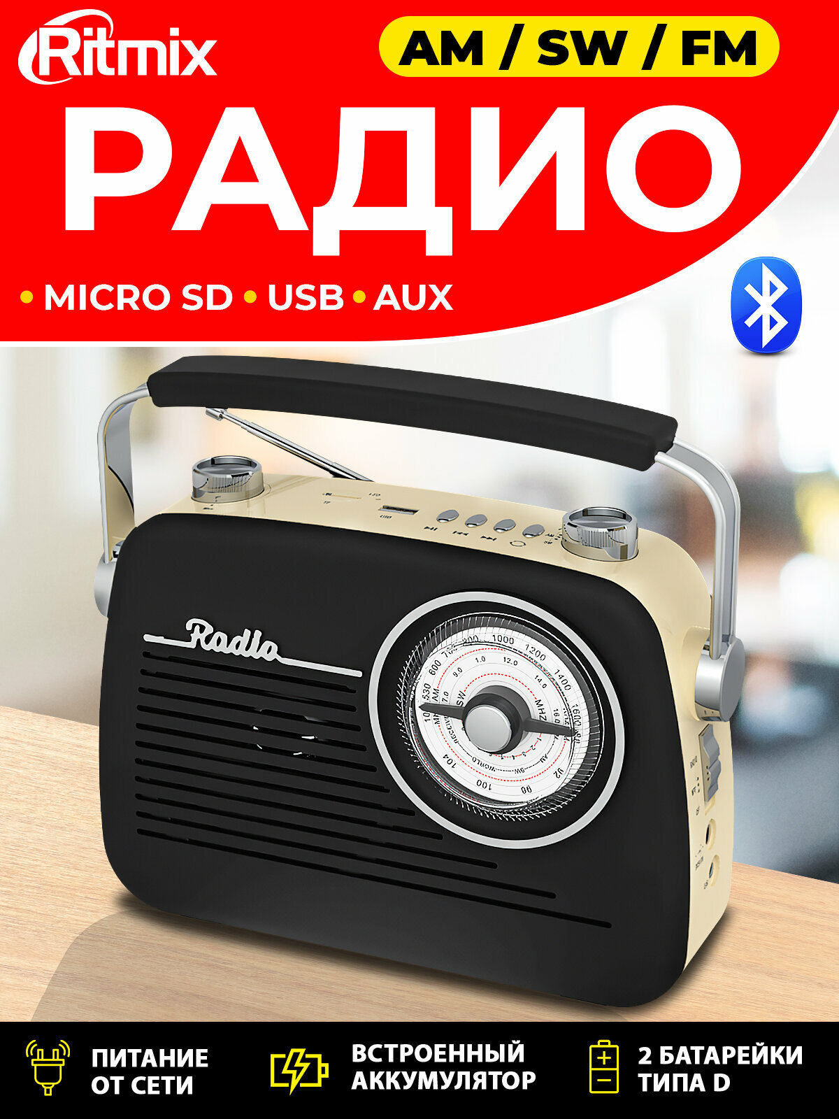 Радиоприемник ретро дизайн RPR-102 black carbon RITMIX УКВ 87,0-108.0МГц Bluetooth; USB, microSD, AUX
