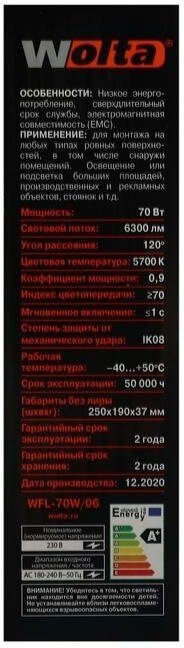 Прожектор светодиодный Wolta 70W (6000Lm) SMD 5500K 6K IP65 250x37x207мм черный WFL-70W/06