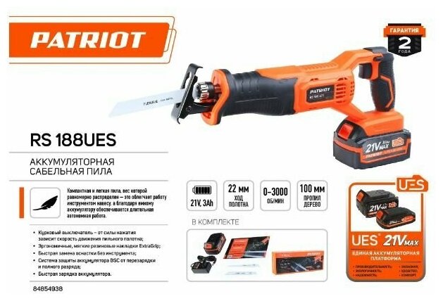 Пила сабельная аккумуляторная PATRIOT RS 188 UES, 21В, АКБ 3А*ч